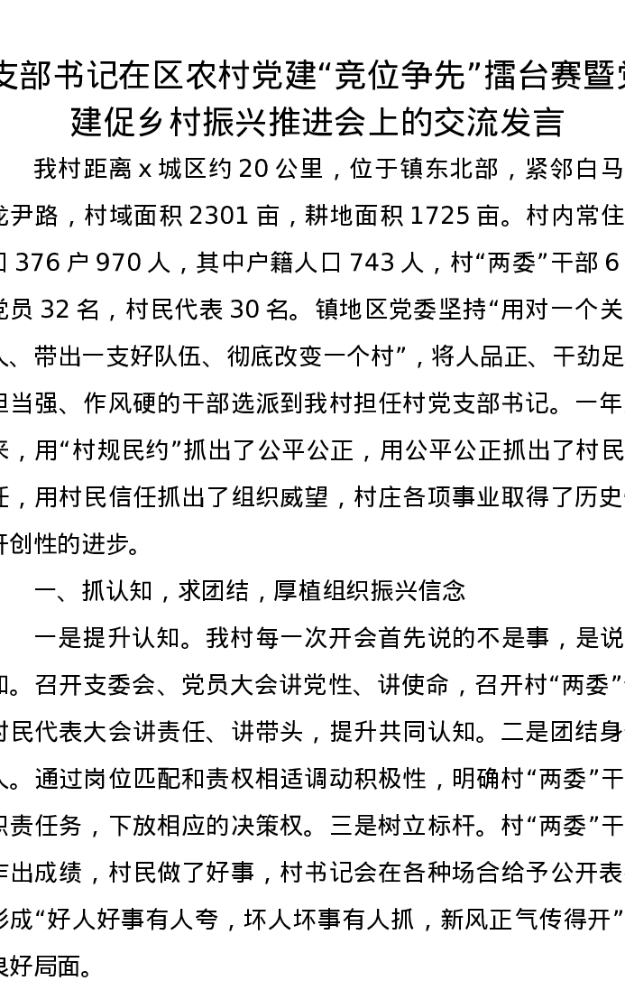 支部书记在区农村党建“竞位争先”擂台赛暨党建促乡村振兴推进会上的交流发言