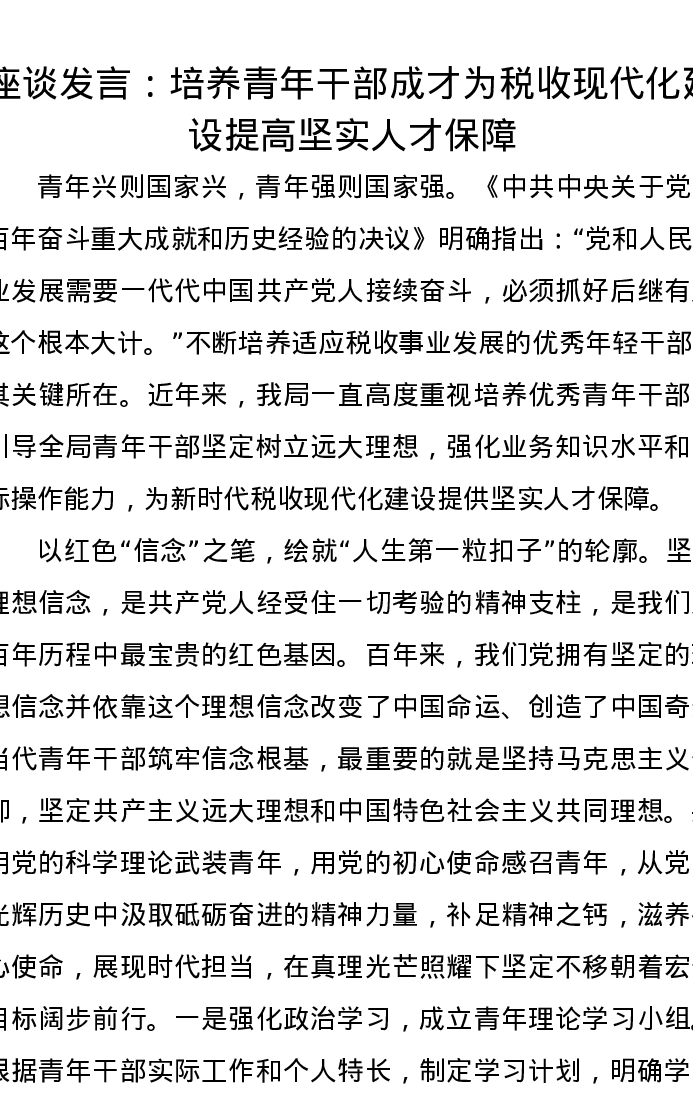 座谈发言:培养青年干部成才为税收现代化建设提高坚实人才保障