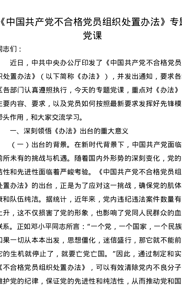 《中国共产党不合格党员组织处置办法》专题党课讲稿