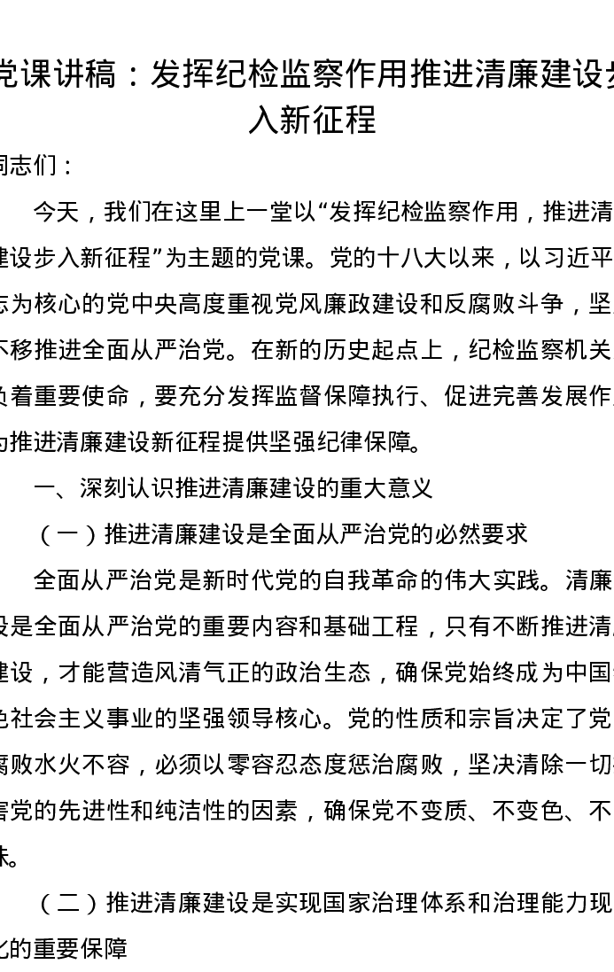 党课讲稿:发挥纪检监察作用,推进清廉建设步入新征程