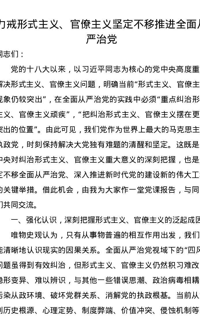 党课讲稿:力戒形式主义、官僚主义坚定不移推进全面从严治党
