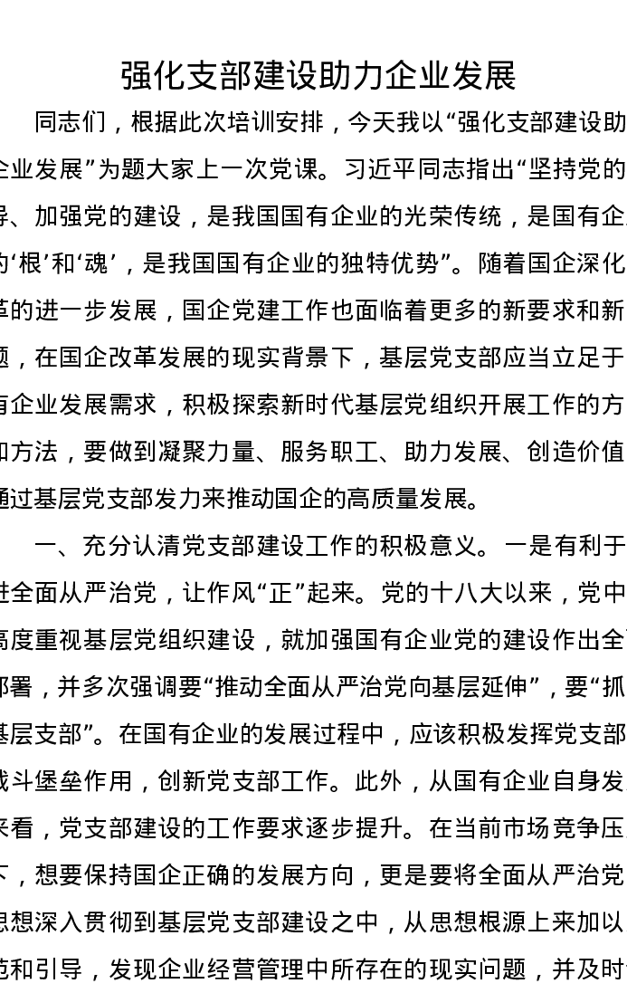 党课讲稿:强化支部建设,助力企业发展