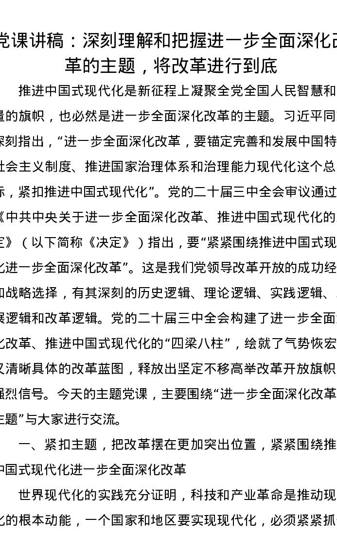 党课讲稿:深刻理解和把握进一步全面深化改革的主题,将改革进行到底