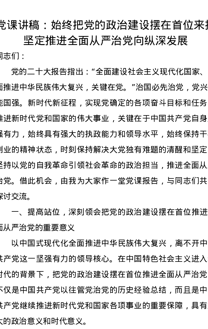 党课讲稿:始终把党的政治建设摆在首位来抓坚定推进全面从严治党向纵深发展