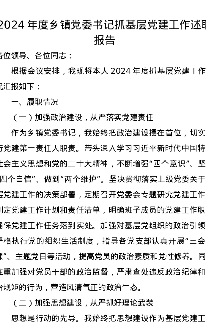 2024年度乡镇党委书记抓基层党建工作述职报告