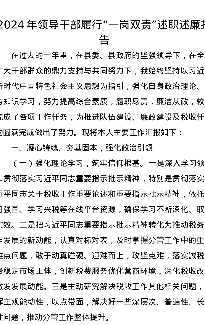 2024年领导干部履行“一岗双责”述职述廉报告