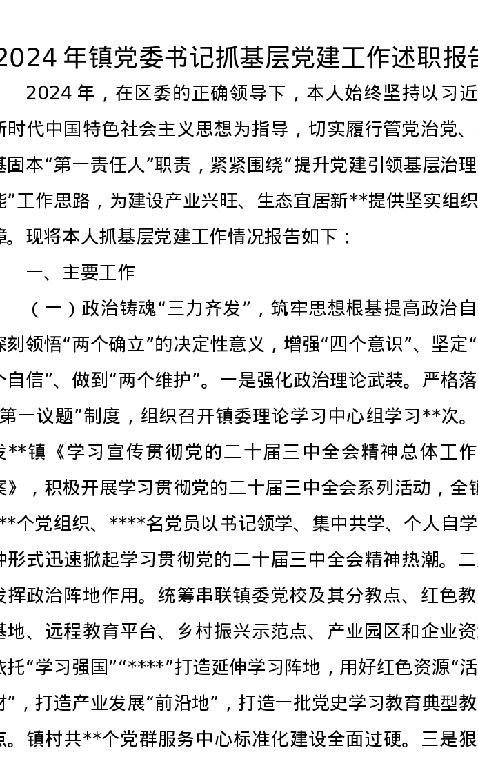 2024年镇党委书记抓基层党建工作述职报告