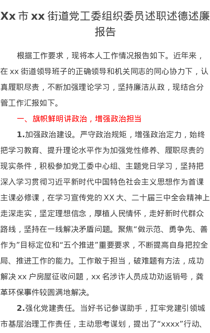 Xx市xx街道党工委组织委员述职述德述廉报告