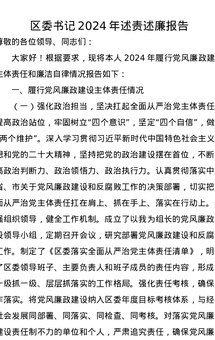 区委书记2024,年述责述廉报告