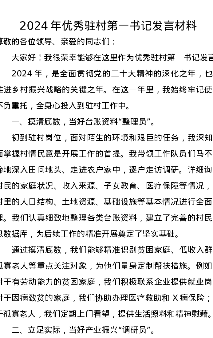 2024年优秀驻村第一书记发言材料