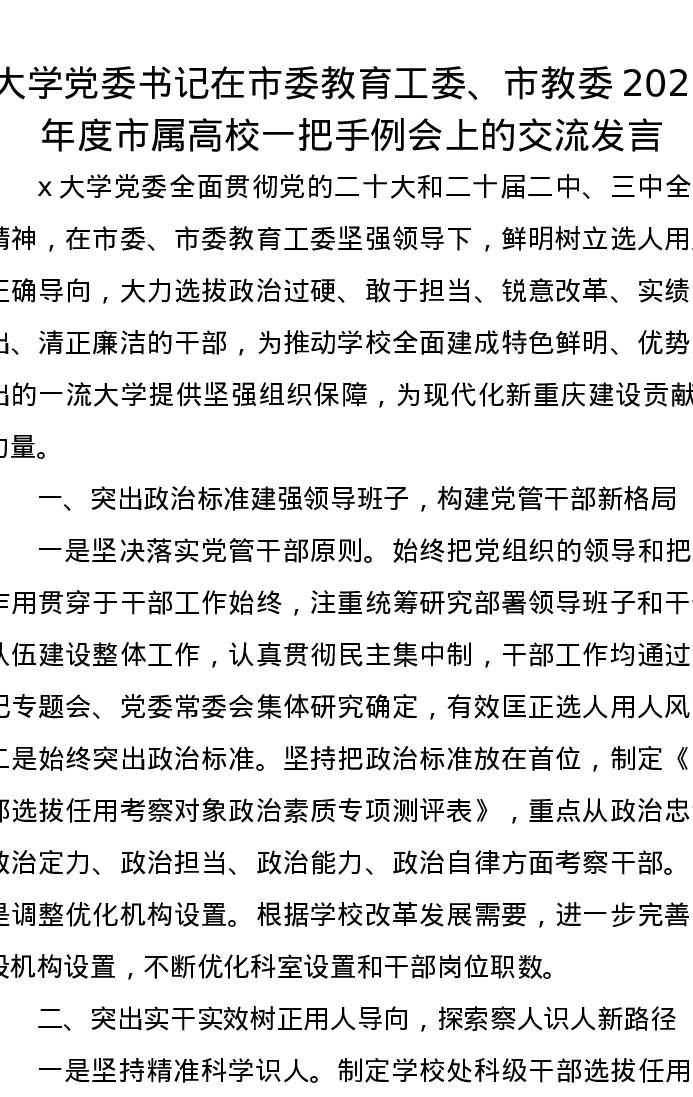 大学党委书记在市委教育工委、市教委2024年度市属高校一把手例会上的交流发言