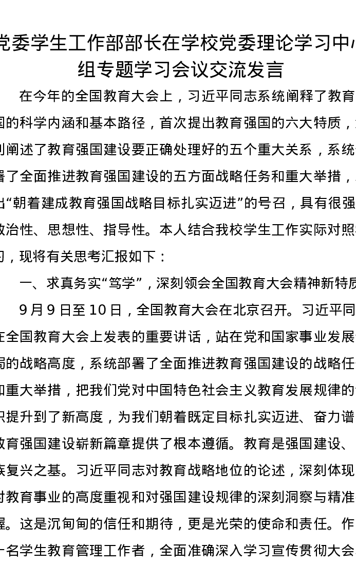 党委学生工作部部长在学校党委理论学习中心组专题学习会议交流发言