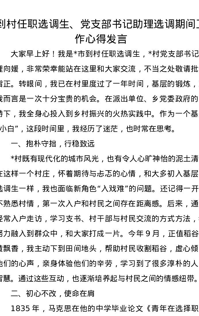 到村任职选调生、党支部书记助理选调期间工作心得发言