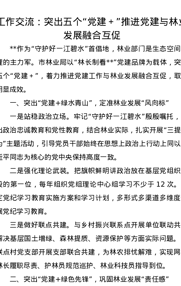 工作交流发言:突出五个“党建+”推进党建与林业发展融合互促