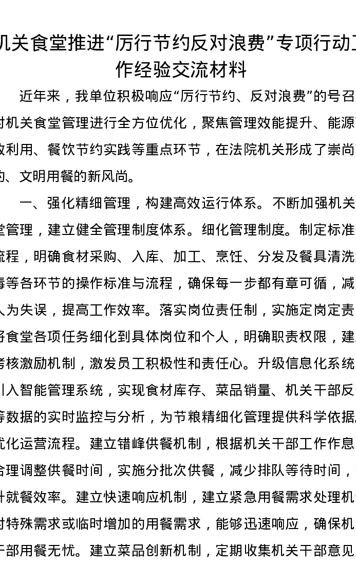 机关食堂推进“厉行节约,反对浪费”专项行动工作经验交流发言材料