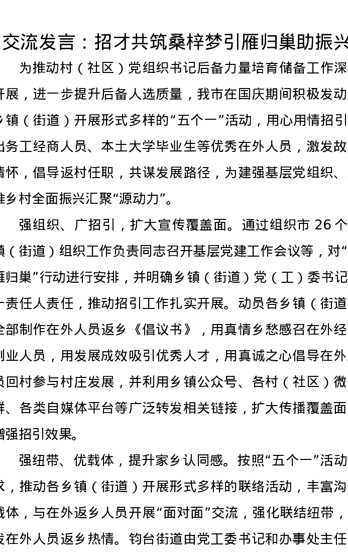 交流发言:招才共筑桑梓梦,引雁归巢助振兴