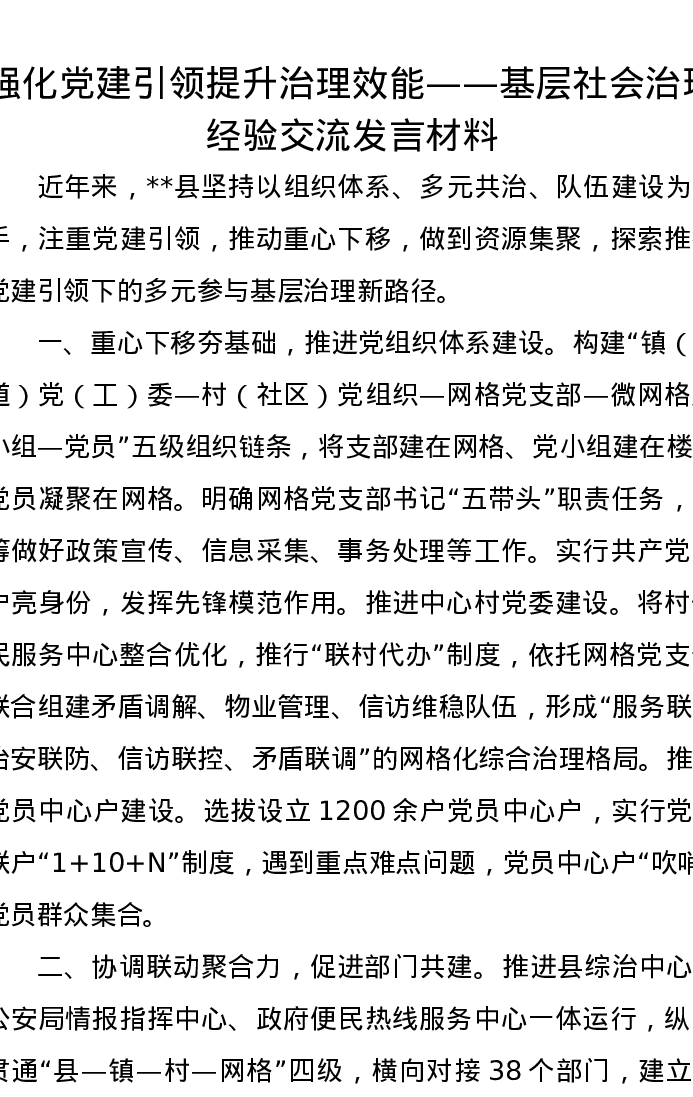 强化党建引领,提升治理效能——基层社会治理经验交流发言材料