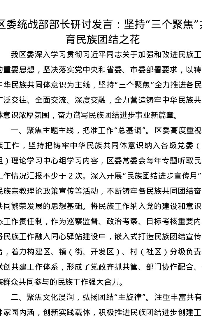 区委统战部部长研讨发言:坚持“三个聚焦”共育民族团结之花
