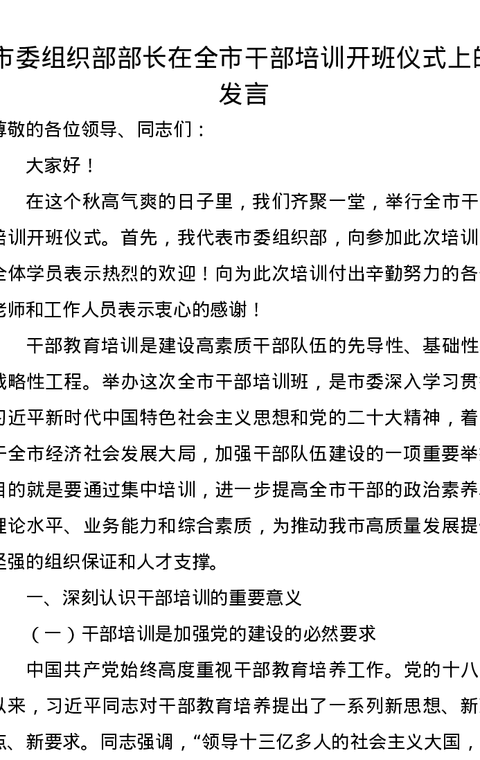 市委组织部部长在全市干部培训开班仪式上的发言