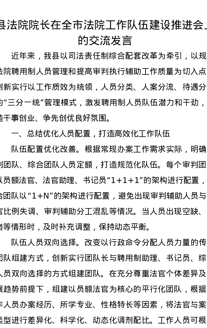 县法院院长在全市法院工作队伍建设推进会上的交流发言
