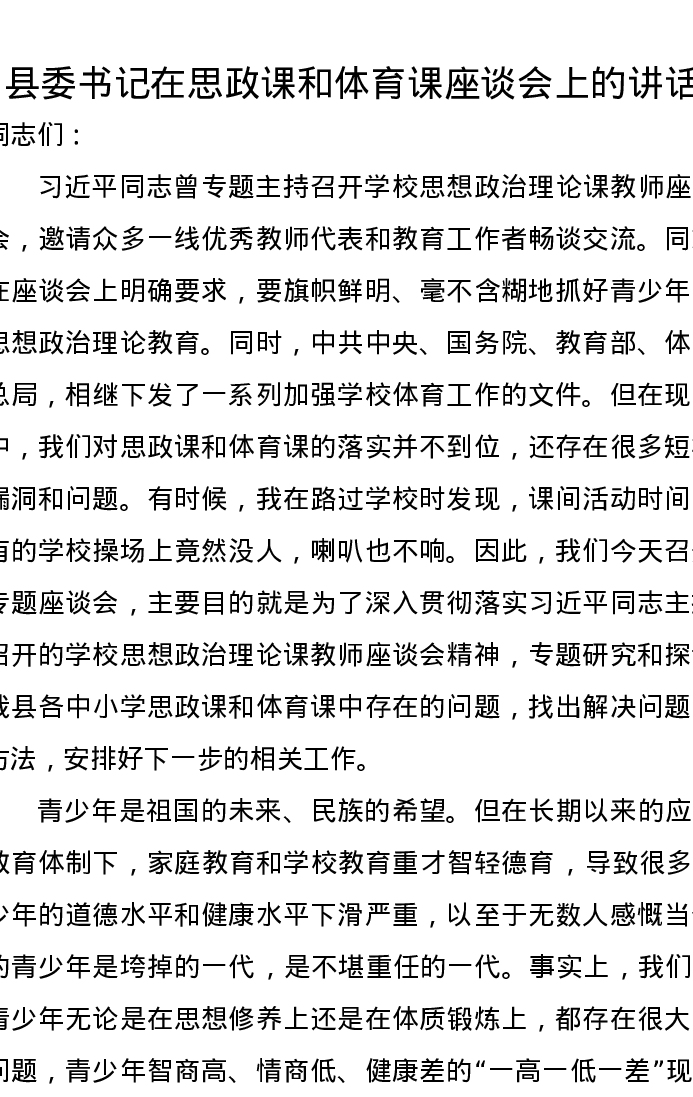 县委书记在思政课和体育课座谈会上的讲话