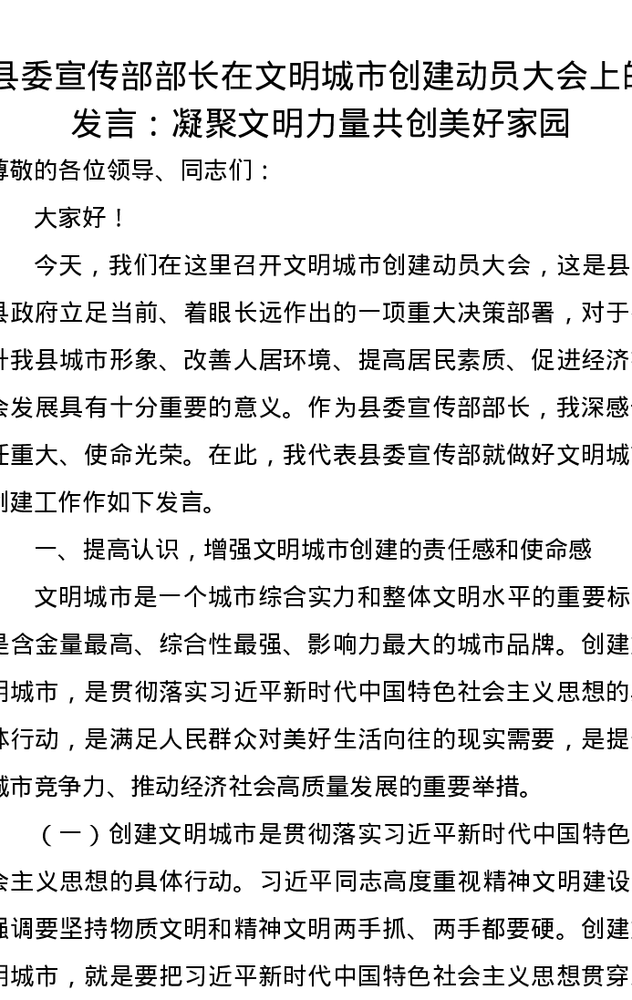 县委宣传部部长在文明城市创建动员大会上的发言:凝聚文明力量,共创美好家园