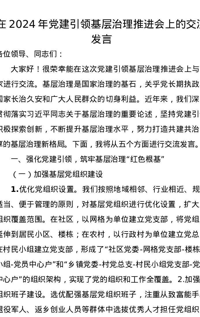 在2024年党建引领基层治理推进会上的交流发言
