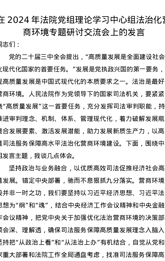 在2024年法院党组理论学习中心组法治化营商环境专题研讨交流会上的发言