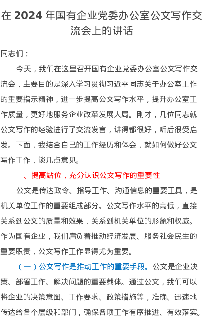 在2024年国有企业党委办公室公文写作交流会上的讲话