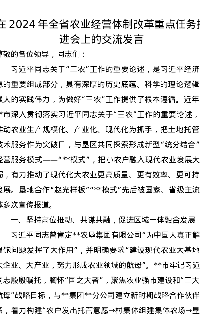 在2024年全省农业经营体制改革重点任务推进会上的交流发言