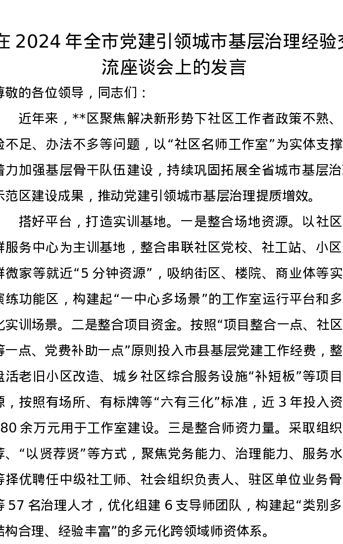 在2024年全市党建引领城市基层治理经验交流座谈会上的发言
