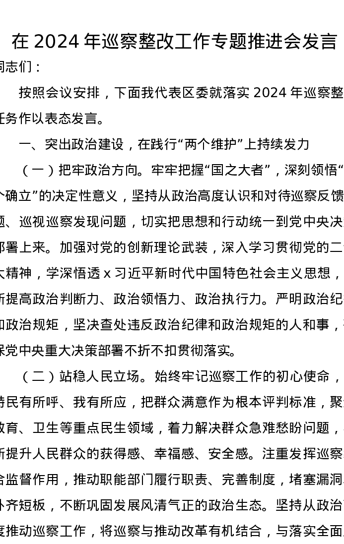 在2024年巡察整改工作专题推进会发言
