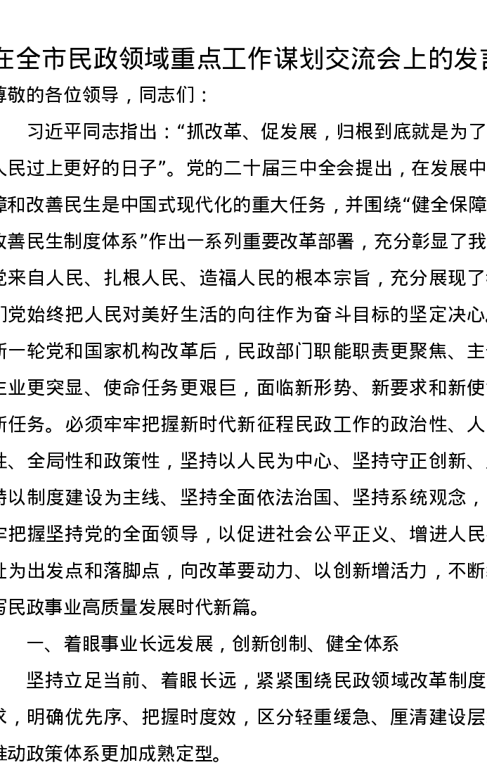 在全市民政领域重点工作谋划交流会上的发言