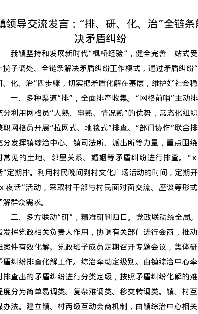 镇领导交流发言:“排、研、化、治”全链条解决矛盾纠纷