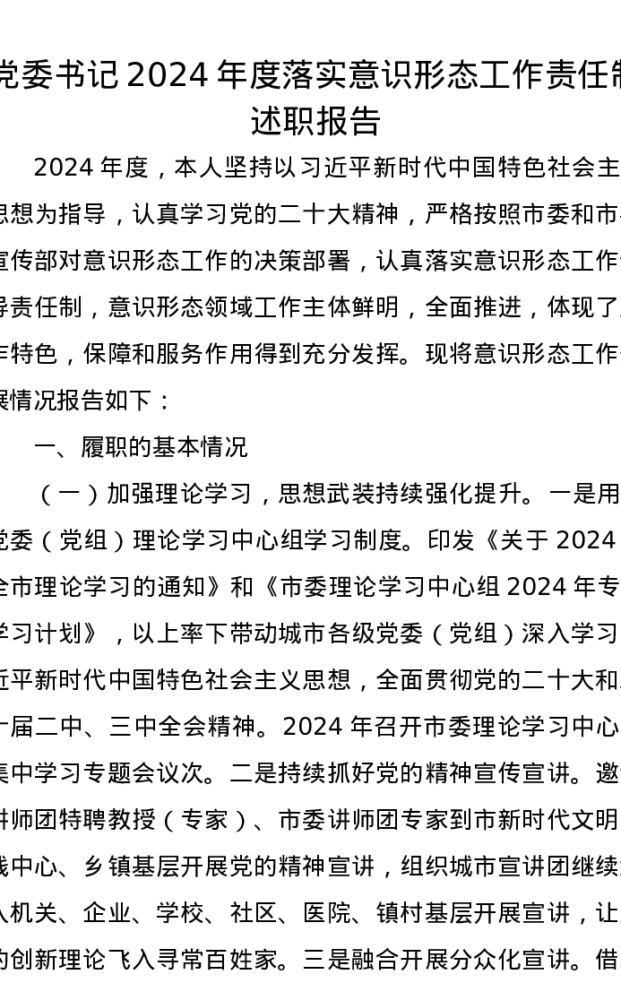党委书记2024年度落实意识形态工作责任制述职报告