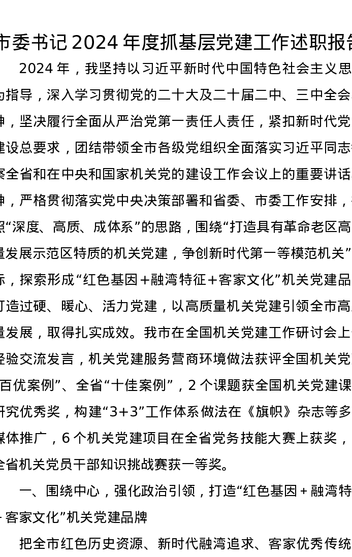 市委书记2024年度抓基层党建工作述职报告