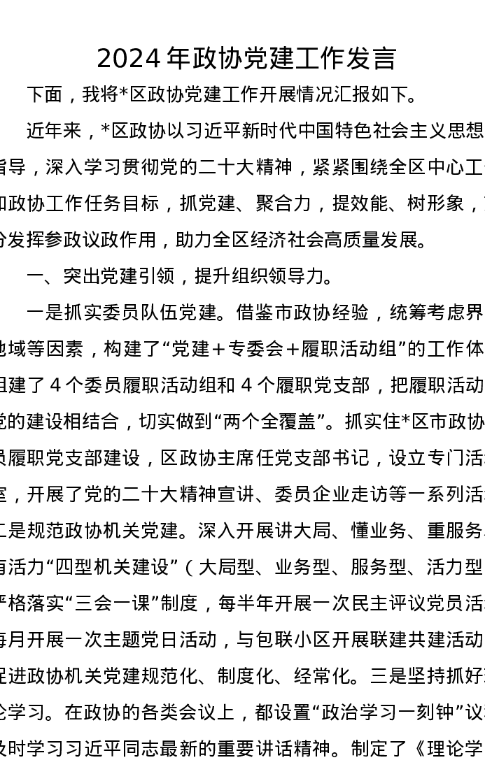 2024年政协党建工作发言