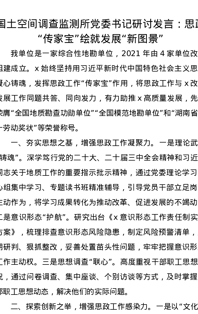 国土空间调查监测所党委书记研讨发言:思政“传家宝”绘就发展“新图景”