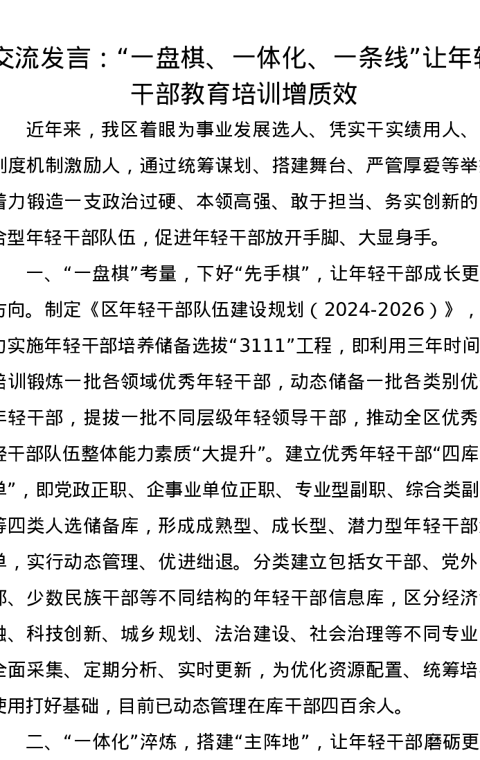 交流发言:“一盘棋、一体化、一条线”,让年轻干部教育培训增质效