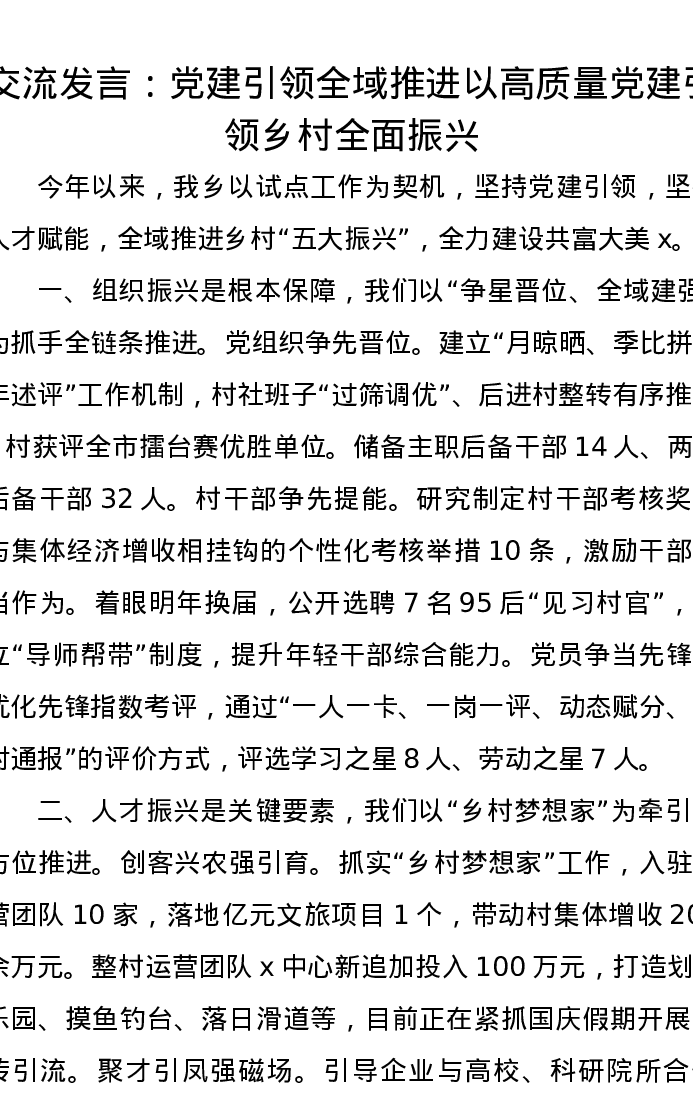 交流发言:党建引领,全域推进,以高质量党建引领乡村全面振兴
