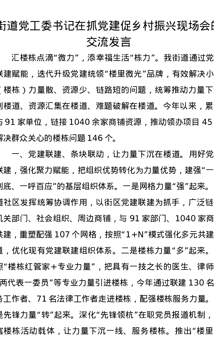 街道党工委书记在抓党建促乡村振兴现场会的交流发言