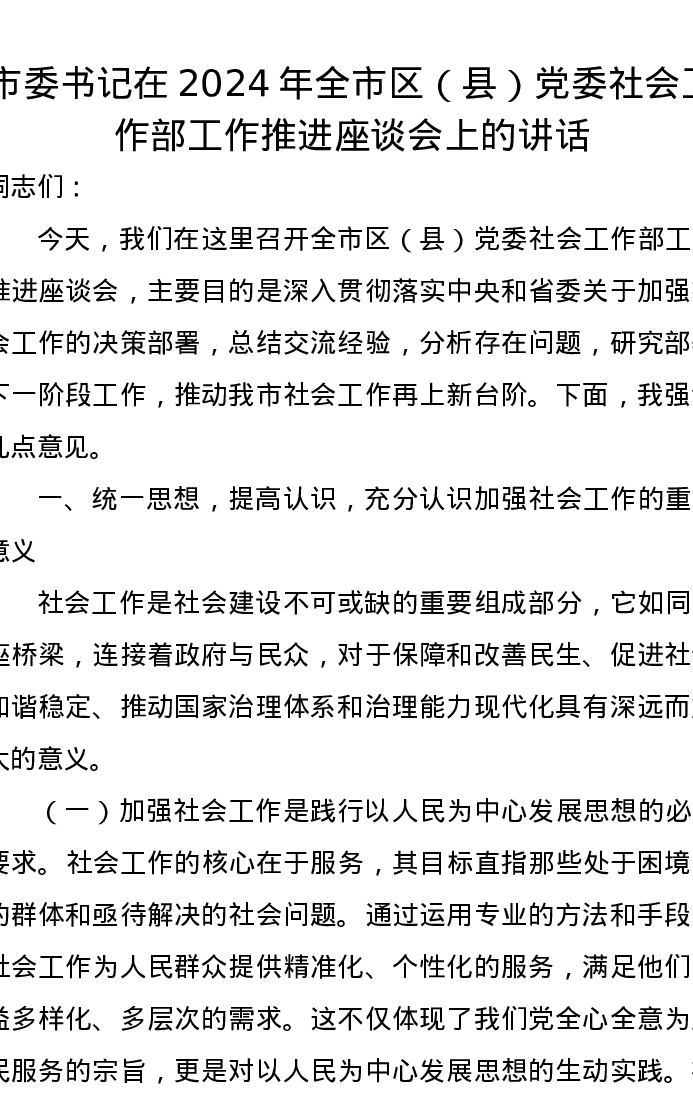 市委书记在2024年全市区(县)党委社会工作部工作推进座谈会上的讲话