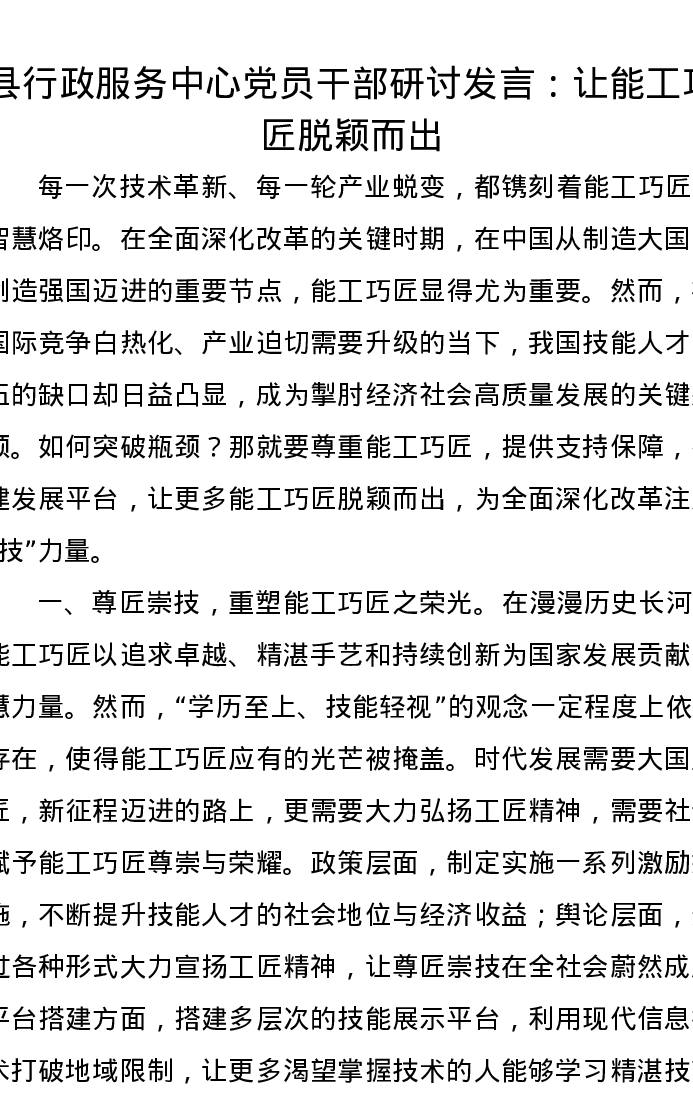 县行政服务中心党员干部研讨发言:让能工巧匠脱颖而出