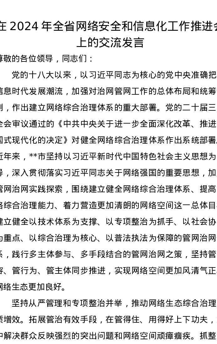 在2024年全省网络安全和信息化工作推进会上的交流发言