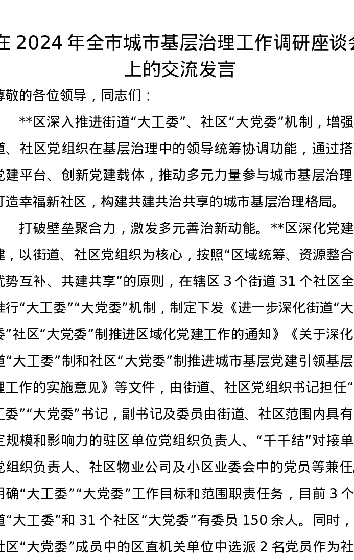 在2024年全市城市基层治理工作调研座谈会上的交流发言