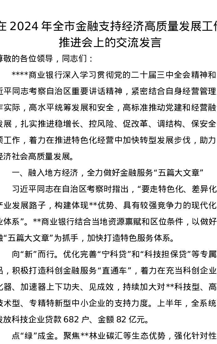 在2024年全市金融支持经济高质量发展工作推进会上的交流发言