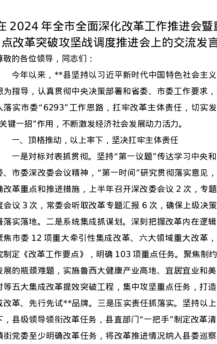 在2024年全市全面深化改革工作推进会暨重点改革突破攻坚战调度推进会上的交流发言