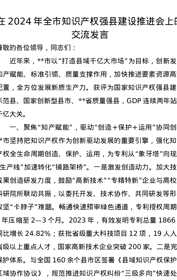 在2024年全市知识产权强县建设推进会上的交流发言