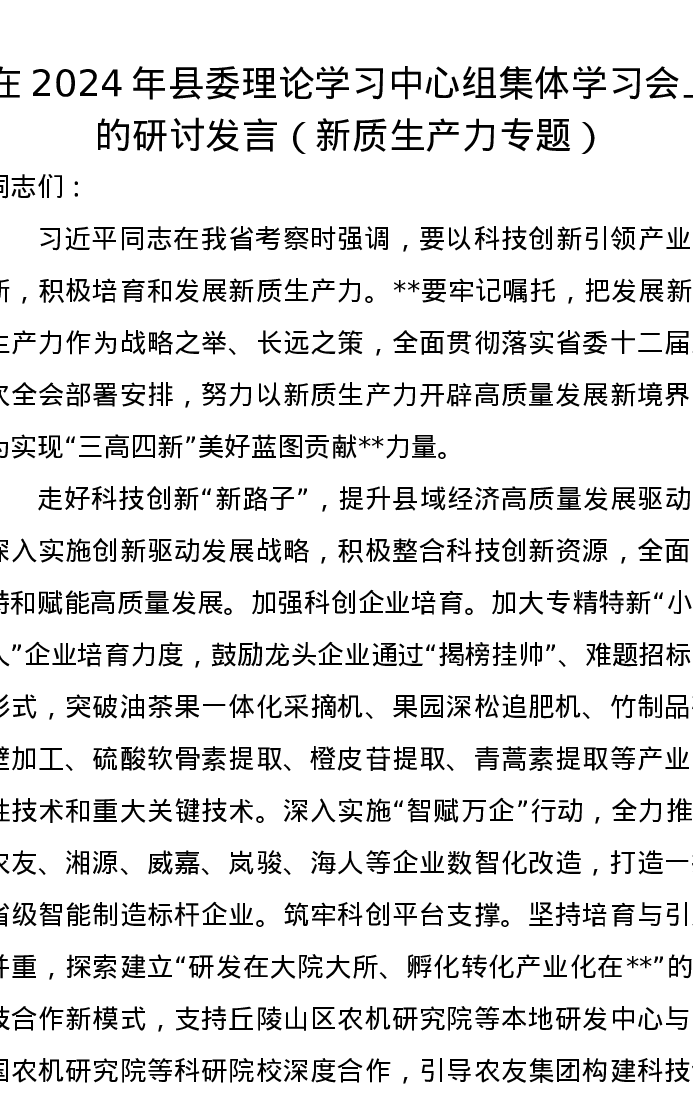 在2024年县委理论学习中心组集体学习会上的研讨发言(新质生产力专题)
