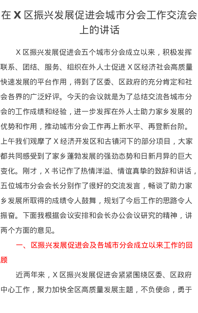 在X区振兴发展促进会城市分会工作交流会上的讲话